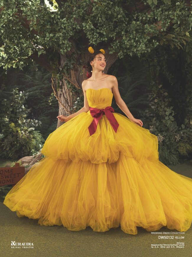 DWS0132 Yellow 「Pooh」| イエローのチュールをたっぷりと使用した、『くまのプーさん』のフォルムを表現したティアードのバルーンシルエットが目を引く ボリュームドレスです。ミカドに『くまのプーさん』の刺繍がされたウエストリボンがポイントです。